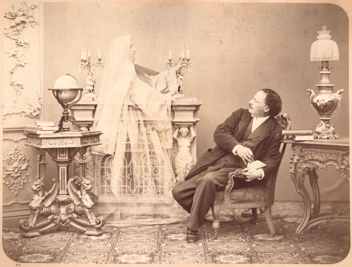 Adolf Ost (active around 1859–1870): Apparition of a Spirit (before 1864). Albumen paper on mounting cardboard, 37.4 × 44.8 cm, Albertina, Vienna. On permanent loan from the Austrian Federal Education and Research Institute for Graphics. Photo copyright © Albertina, Vienna. Hidden Modernism: The Fascination with the Occcult Around 1900 catalogue page 279.