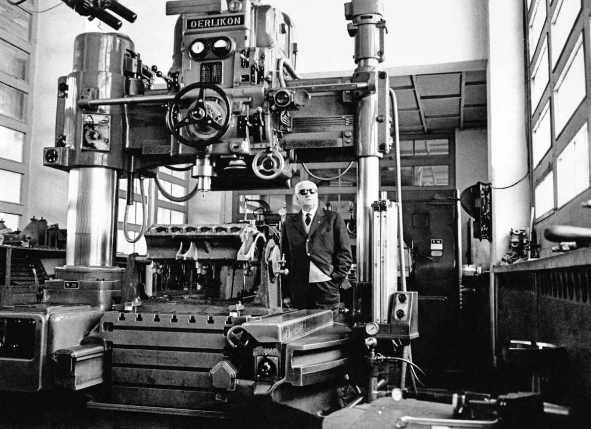 An imposing-looking Enzo Ferrari watches work being done on a 12- cylinder engine. Photo copyright © MONDADORI PORTFOLIO, via Getty Images. Page 436 of Pino Allievi’s richly illustrated Ferrari book. The Swiss may recognize that Ferrari used a Swiss precision machine, as indicated by the “Oerlikon” sign.