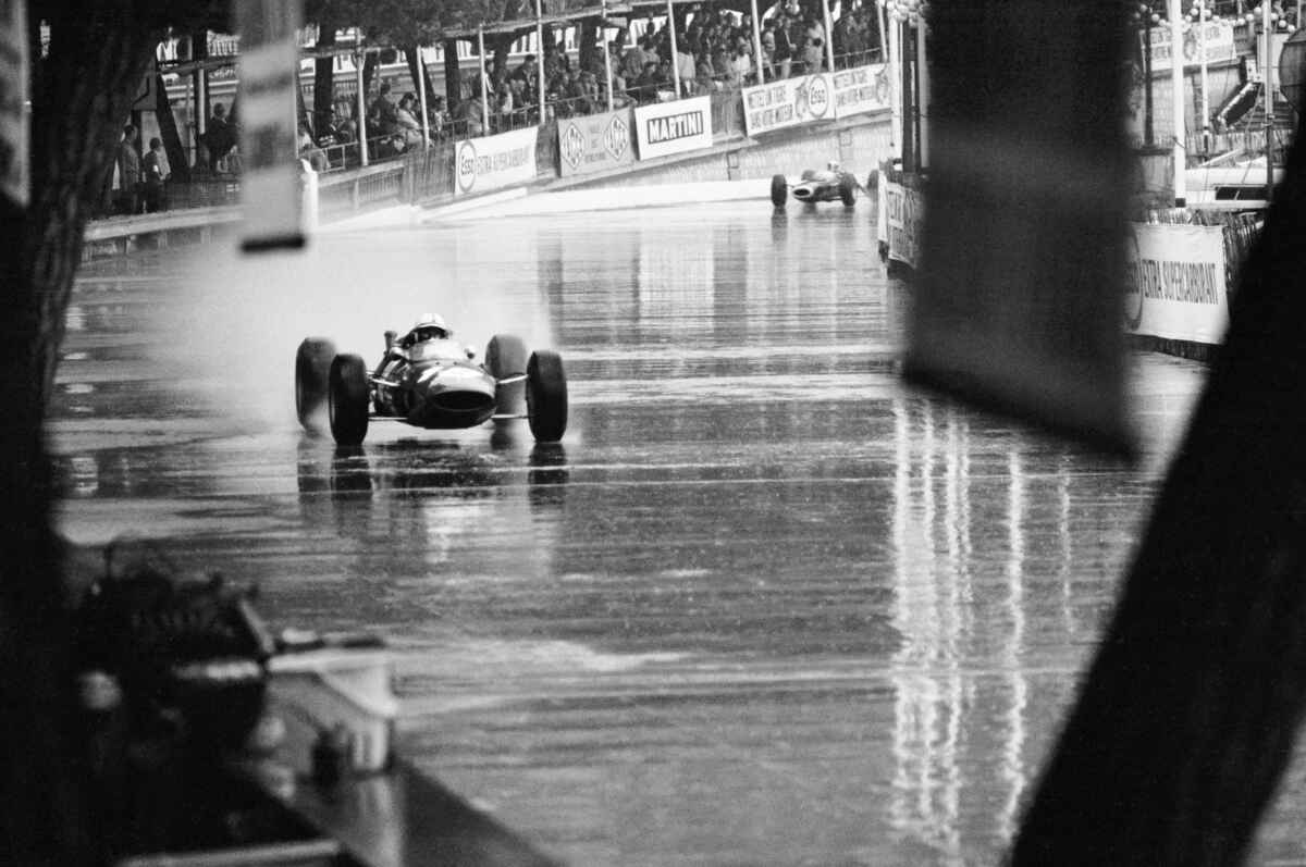 The Ferrari 158 of John Surtees appears to be floating on water at the British Grand Prix of 1963, where the English driver came second, preceded by Jim Clark with the Lotus-Climax. Photograph copyright © Jesse Alexander, courtesy of Fahey/Klein Gallery, Los Angeles. Pages 230/231 of Pino Allievi’s richly illustrated Ferrari book.