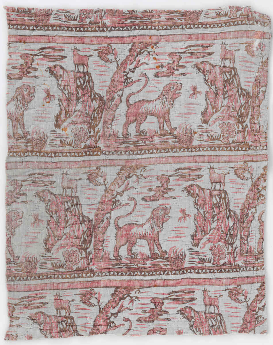 Fabric for the trade in enslaved people, Le lion et la chèvre, Indiennes, Manufacture Petitpierre & Cie., Nantes, late 18th century, woodblock print on cotton fabric. Photo copyright © Swiss National Museum. Page 116 of the catalogue colonial – Switzerland’s Global Entanglements.